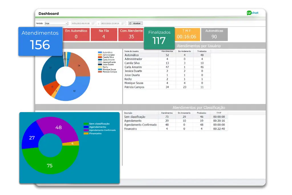 Obtenha de forma prática e rápida os principais indicadores de atendimento da sua empresa. Com o GTchat, você tem acesso a informações valiosas que impulsionam a performance da sua equipe. Monitore facilmente o desempenho, identifique áreas de melhoria e tome decisões informadas para otimizar o atendimento ao cliente.